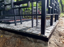 Первым делом мы демонтировали с территории участка кресты и ограждение, параллельно готовя землю к брусчатке. Когда подготовительные работы были завершены мы установили оградке, по низу которой сделали периметр из опалубки для последующей заливки бетоном.